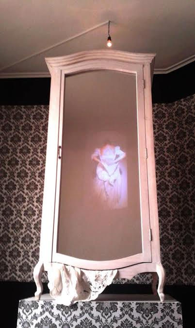 En la parte de adentro de un armario antiguo, se reproduce un video en loop de una mujer que intenta ponerse forzada y desesperadamente un vestido de novia mediante una pantalla de televisor LCD en modo vertical. En la parte delantera del armario, hay un espejo traslúcido en donde el espectador además de encontrar su reflejo, puede observar una mujer atrapada en el armario desesperada por entrar en el vestido.